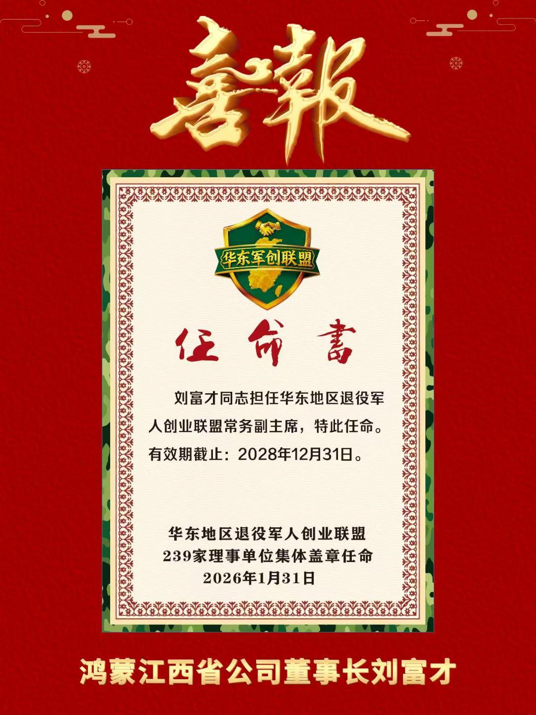 喜报:鸿蒙江西省公司董事长刘富才获颁华东地区退役军人创业联盟... -